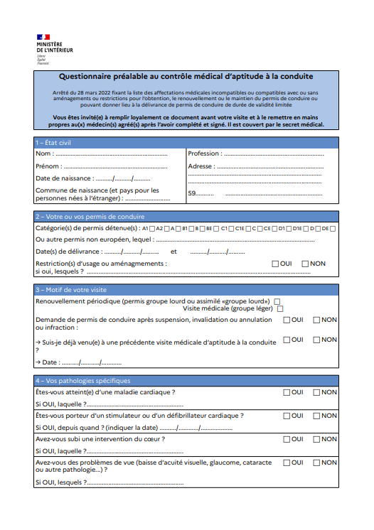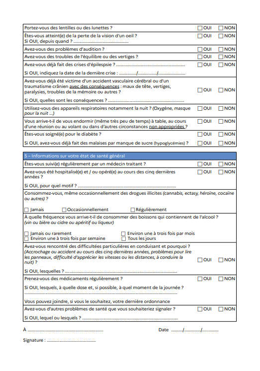 Questionnaire préalable au contrôle médicale d'aptitude à la conduite